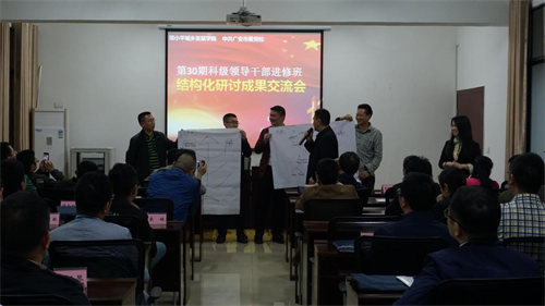 4月2日晚上,在市委党校“催化师”的主持下,两个班学员共分成八组,以“如何提高执行力”为主题进行结构化研讨。各组学员沿着“问题表现——原因分析——解决对策”的研讨思路,进行提炼归纳和总结。