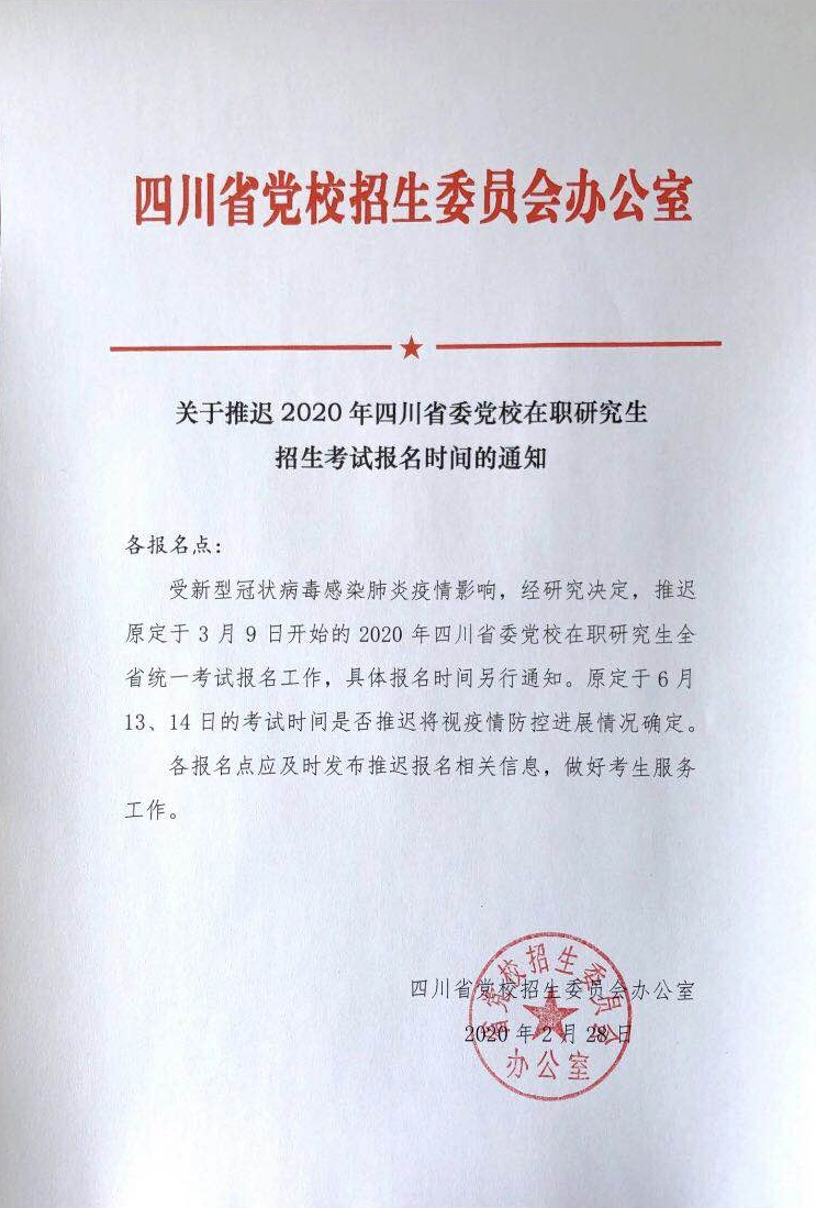 关于推迟2020年四川省委党校在职研究生招生考试报名时间的通知