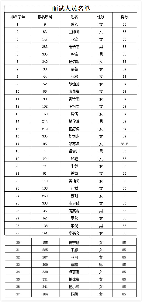 (三)此次只公示进入面试环节应聘者成绩,其他应聘者可向杨老师、唐老师、胡老师电话查询成绩。