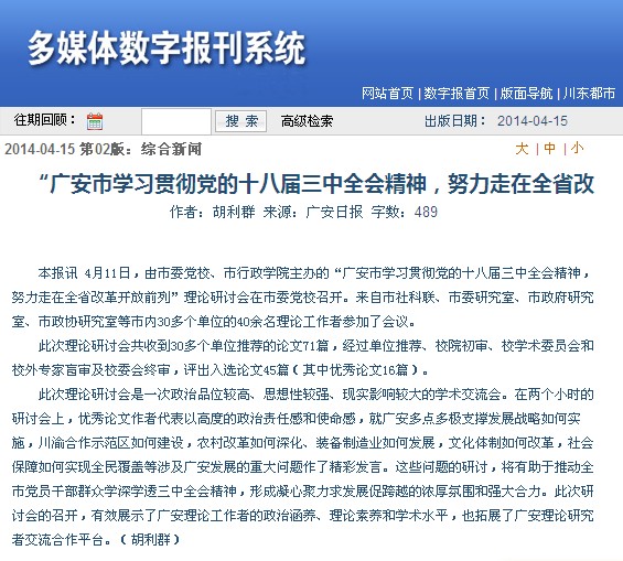【广安日报】“广安市学习贯彻党的十八届三中全会精神,努力走在全省改革开放前列”理论研讨会举行