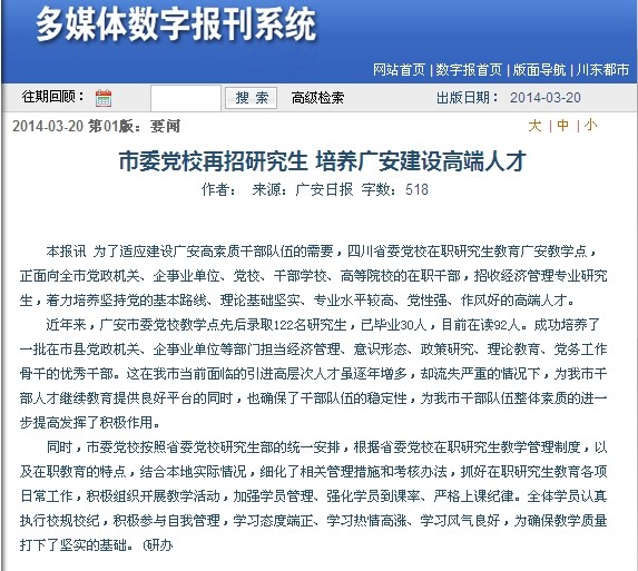 【广安日报】市委党校再招研究生 培养广安建设高端人才
