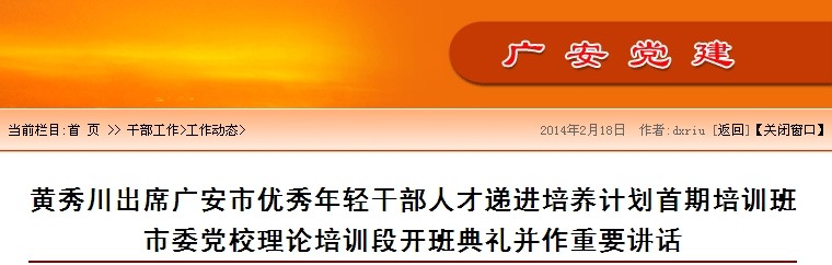 【广安党建网】黄秀川出席广安市优秀年轻干部人才递进培养计划首期培训班市委党校理论培训段开学典礼并作重