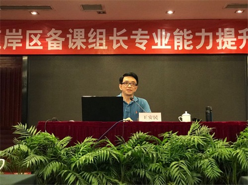 培训期间还安排了重庆市渝中区教师进修学院物理教研员王安民老师做了题为《校本教研的策划与实施》的报告。王老师讲解了何为校本教研,并根据当前校本教研调查情况介绍了新时期校本研修要努力实现的五大转变,指出校本教研要坚持实践取向——为改善行动而研究,要坚持问题导向——植根于教学真问题。此外,他还介绍了渝中区教师进修学院理科组"233"特色教研活动经验,分享了基于团队合作助力年轻教师发展的集体备课流程。然后通过介绍2014秋渝中区物理基地同课异构活动谈到了解决评课"空、浅、倒"问题的方法。整个教学过程,王老师始终面带微笑,娓娓道来,让人如坐春风。