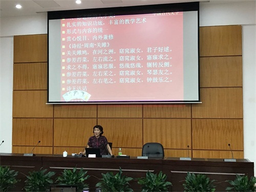 学院还邀请了西南大学李达武教授讲授《国学教育》,李教授以一首《登鹳雀楼》拉开讲座序幕,将词句以七言、五言、四字分类并配以耳熟能详的曲调进行吟唱,通俗又不失优雅。以诗句为引,引出联想故事,丰富了大家对国学的认知。现场气氛被李教授带动,大家都积极地配合着,吟唱着,对国学有了新的体验和收获。