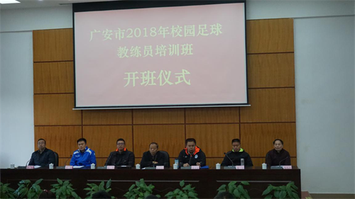 3月8日下午,由广安市关工委、广安市教体局主办的“广安市2018年校园足球教练员培训班”在我院举行开班仪式,参训学员110人,市关工委常务副主任郭修忠,成都体育学院教授、国家级足球裁判员杨次榆,成都体育学院足球运动学院副教授詹阳,成都体育学院足球运动学院培训部副主任、副教授兰亚,四川省校园足球协会副秘书长谭涌等出席了开班仪式,开班仪式由市教体局党组成员、市教育工会主席申江主持。