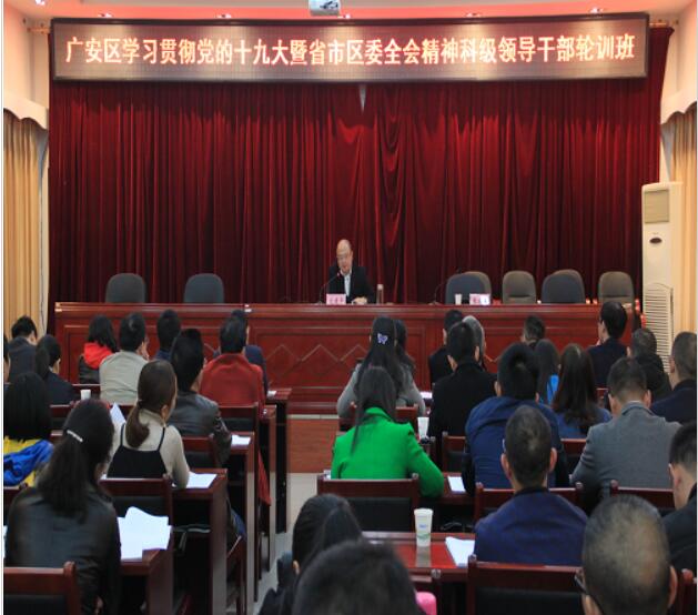 10月23日上午,广安市人大常委会副主任、广安区委书记文建平为广安区学习贯彻党的十九大暨省市区委全会精神科级领导干部轮训班学员作了专题报告