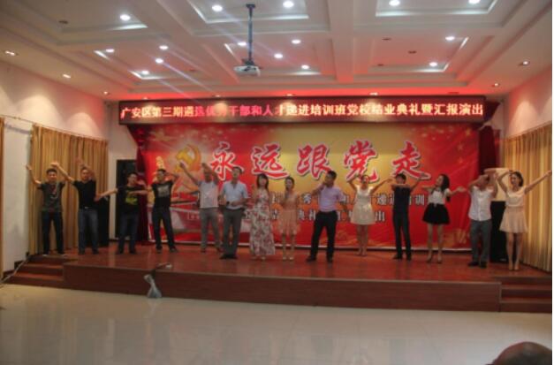 近日,广安区第三期遴选优秀干部和人才理论培训班结业典礼暨汇报演出在广安区委党校报告厅隆重举行,区委组织部部长陈松柏、区委组织部副部长吕沁洪、区委党校常务副校长刘建忠出席典礼。