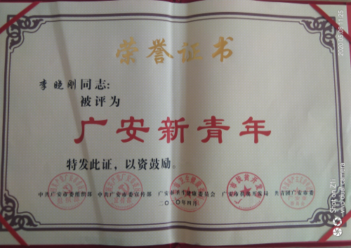 在纪念五四运动101周年之际,由广安市委组织部、市委宣传部、市扶贫开发局、团市委联合评选的“广安新青年”名单新鲜出炉。小平干部学院(广安市委党校)科研部副部长李晓刚同志作为院(校)派往武胜县鸣钟镇大石村第一书记荣获“广安新青年”称号。